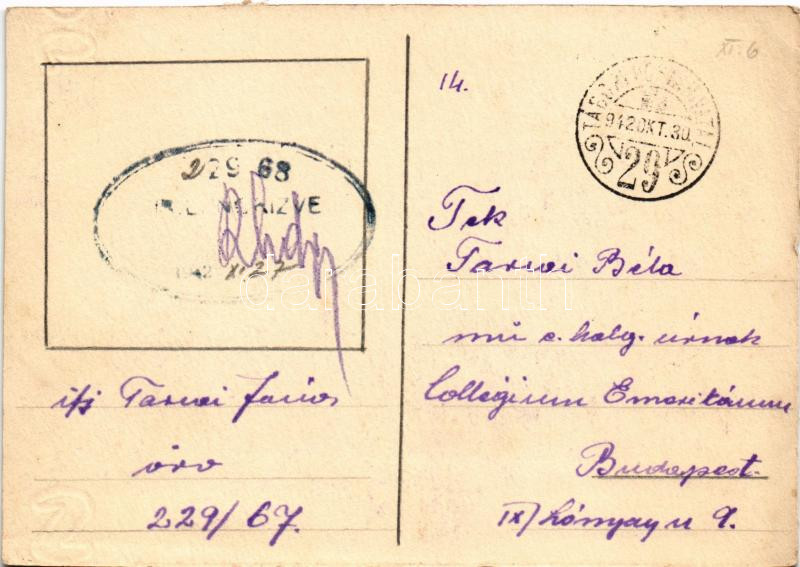 1942 Második világháborús tábori postai levelezőlap, a feladó saját kezű grafikájával, távcső / WWII Hungarian military field postcard, hand-drawn graphic art, telescope + "Tábori postahivatal 29" (vágott / cut)