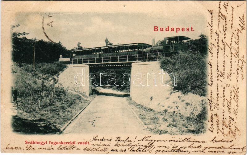 1899 Budapest XII. Svábhegy, Fogaskerekű vasút, gőzmozdony, vonat, vasúti híd (lyuk / pinhole)