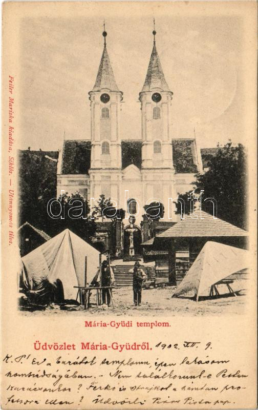 1902 Máriagyűd (Siklós), kegytemplom, piac. Feiler Mariska kiadása (EK)