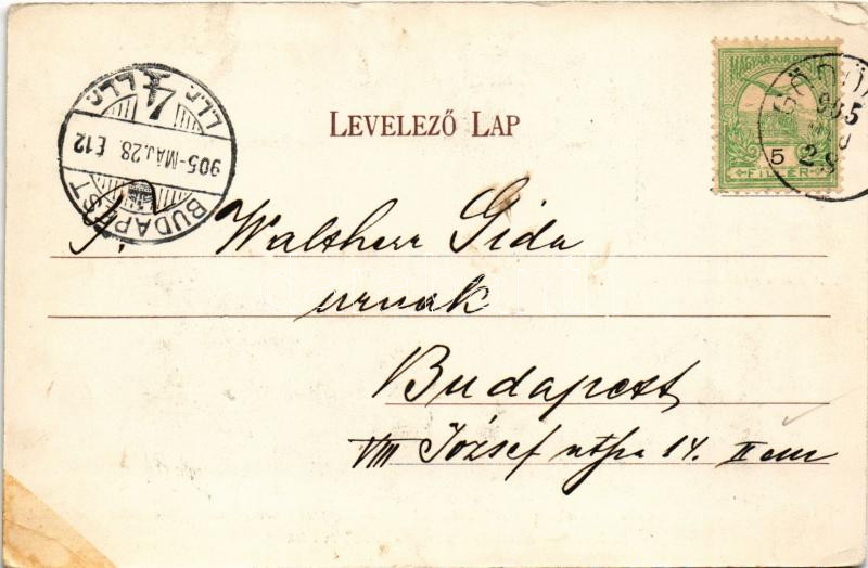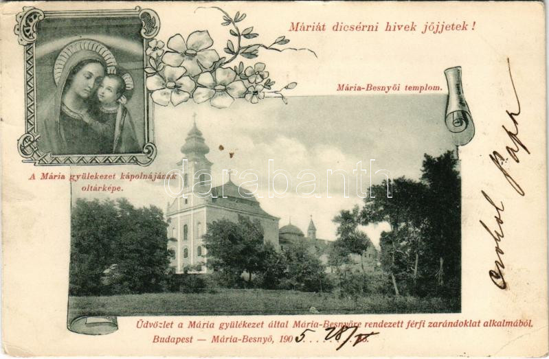 1905 Máriabesnyő (Gödöllő), kegytemplom, Mária gyülekezet kápolnájának oltárképe. Üdvözlet a Mária gyülekezet által Mária-Besnyőre rendezett férfi zarándoklat alkalmából. Art Nouveau, floral (EB)