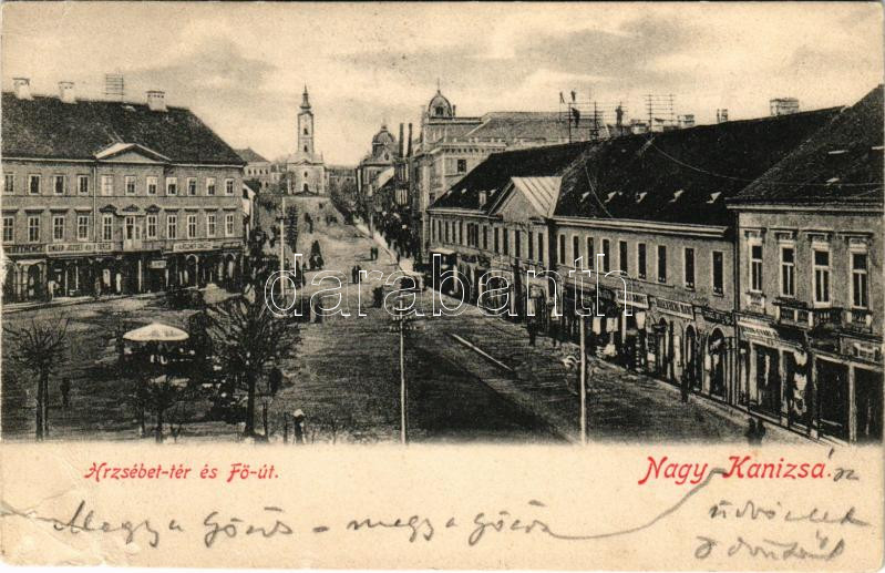 1905 Nagykanizsa, Erzsébet tér és Fő utca, Rosenberg Manó, Keleti, Weiss, Singer József és Társa üzlete, piac (fa)