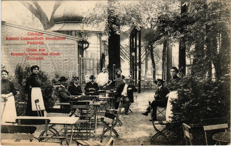1913 Budapest II. Krámer Császárfürdő kioszkja, étterem kerthelyisége vendégekkel és pincérnőkkel (Rb)