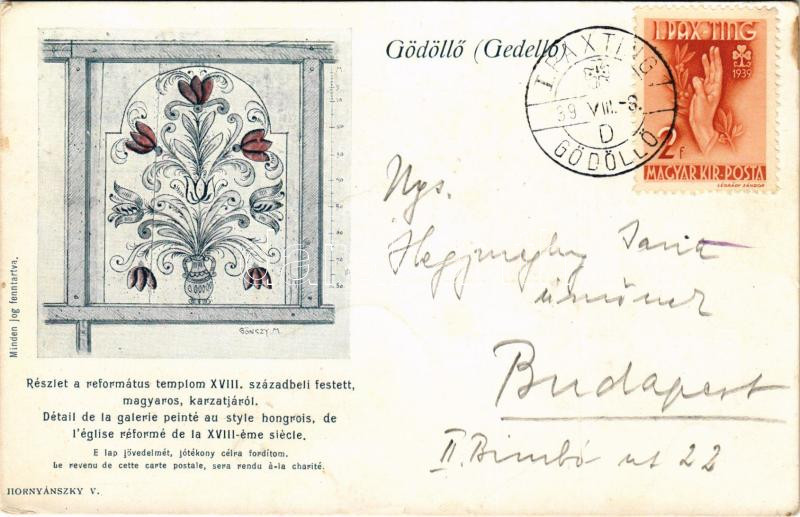 1939 Gödöllő (Gedellő), Részlet a református templom XVIII. századbeli festett, magyaros karzatjáról. Hornyánszky V. TCV card + "I. PAXTING GÖDÖLLŐ" (Rb)