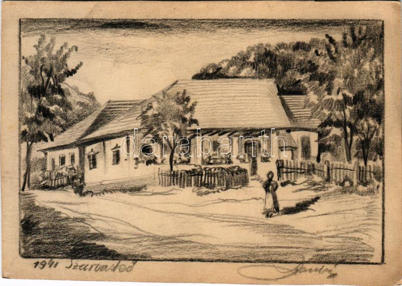1941 Szarvaskő, ház, utcakép, saját kezűleg rajzolt képeslap + "Szarvaskő postai ügyn." (vágott / cut)