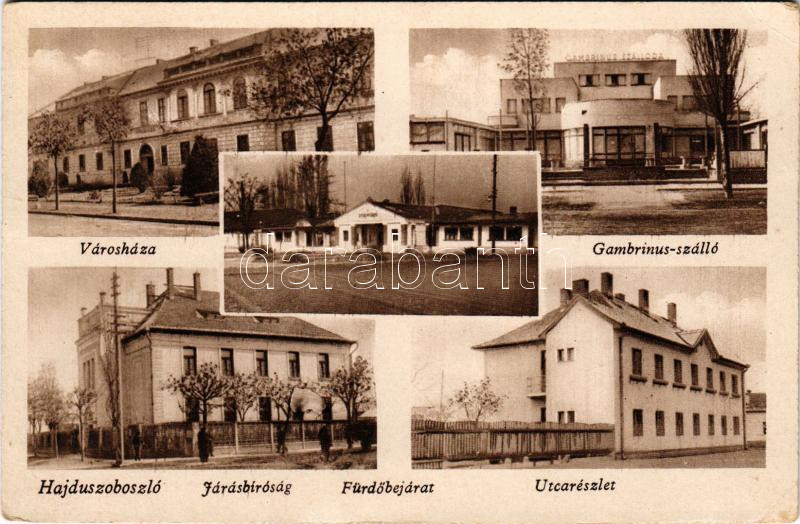 1948 Hajdúszoboszló, Városháza, Gambrinus szálloda, Járásbíróság, Fürdőbejárat, utca részlet (EK)