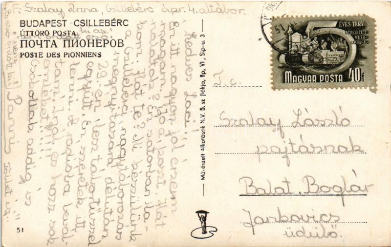 1951 Budapest XII. Csillebérci Úttörőtábor, úttörő posta. Művészeti Alkotások (r)