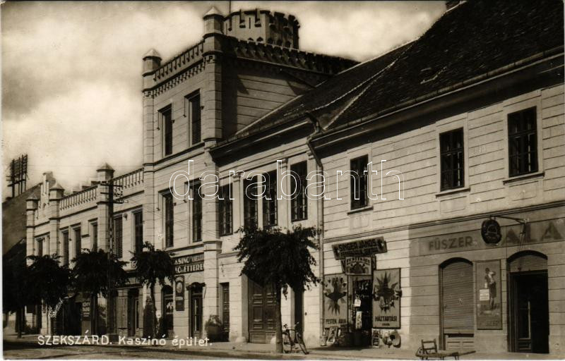 Szekszárd, Kaszinó épület, vendéglő és étterem, Singer János háztartási cikkek és festékáruk üzlete, könyv, papír és zenemű kereskedés. Weisz Andor kiadása