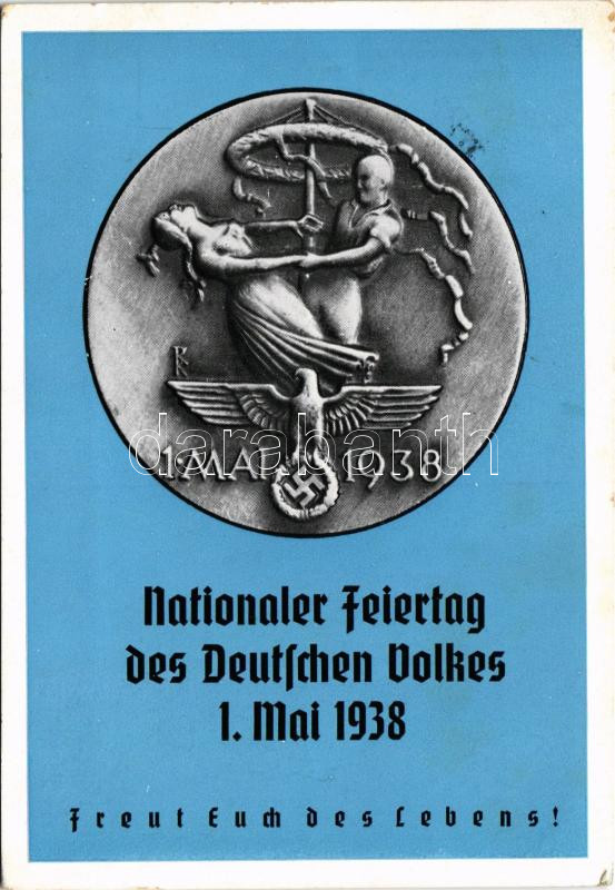 1938 Natinonaler Feiertag des Deutschen Volkes 1. Mai 1938, Freuth Euch des Lebens! / Adolf Hitler, NSDAP German Nazi Party propaganda, swastika + "München Hauptstadt der Bewegung" So. Stpl. (EM)