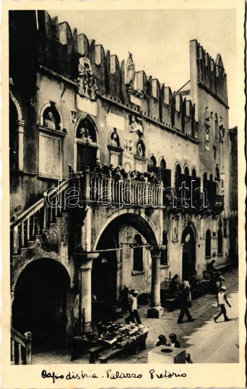 Koper, Capodistria, Capo D'Istria; Palazzo Pretorio. Benedetto Lonzar / palace, market vendors