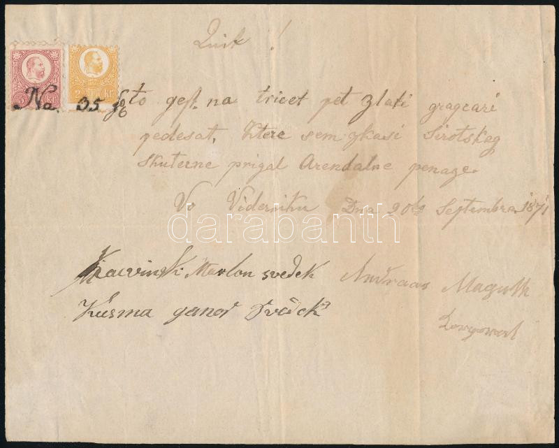 1871 Számla okmánybélyeg hiányában Réznyomat 2kr + 5kr felhasználásával, a felragasztás után az alatta levő szövegrészletet a bélyegekre írták (garancia nélkül / no guarantee)