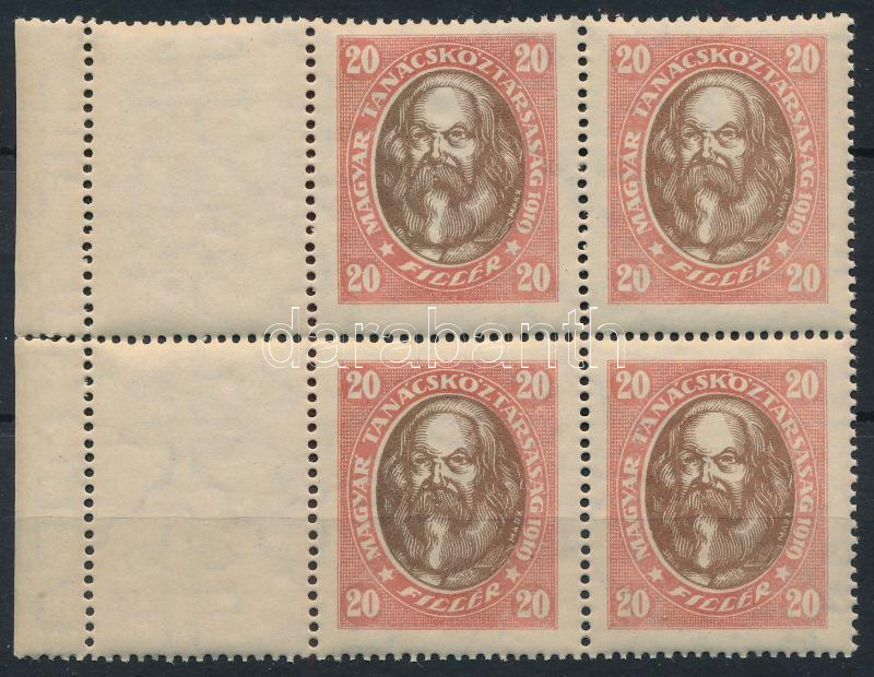 1919 Magyar Tanácsköztársasági arcképek 20f négyestömb álló vízjellel, bal oldalt üres mezőkkel (112.000)