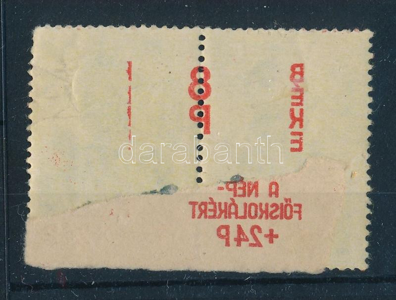 1945 Béke 8P/50f pár látványosan eltolódott felülnyomással, annak gépszínátnyomatával. Hátoldalon betapadt papírdarab, amire szintén került színátnyomat!