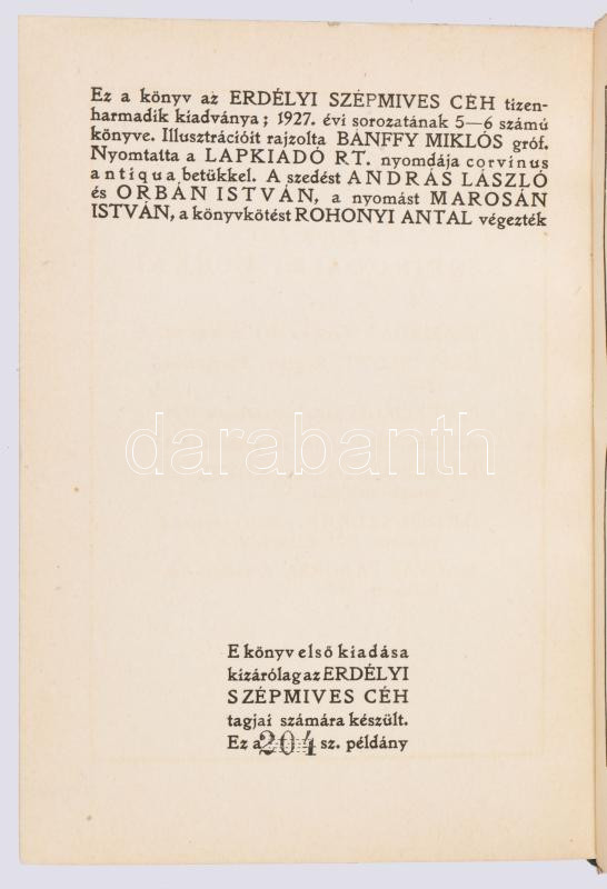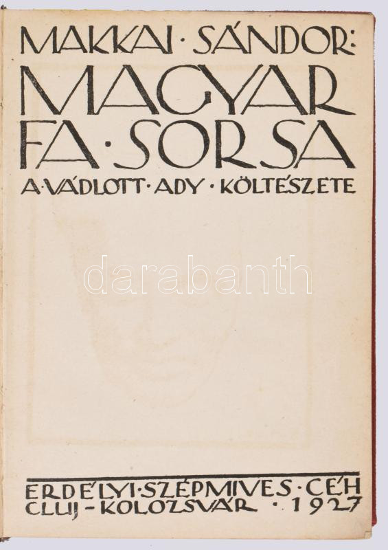 Makkai Sándor: Magyar fa sorsa. A vádlott Ady költészete. Cluj-Kolozsvár, 1927, Erdélyi Szépmíves Céh, (Lapkiadó-ny.), 144+4 +VI (Erdélyi Szépmíves Céh tagjainak névsora) p. Első, számozott, bibliofil kiadás. 204. számú példány. "Ez a könyv Ujságíró Klub Nagyvárad Számára készült, aki az Erdélyi Szépmíves Céh tagja." Oldalszámozáson belül Gróf Bánffy Miklós 4 fekete-fehér illusztrációjával.