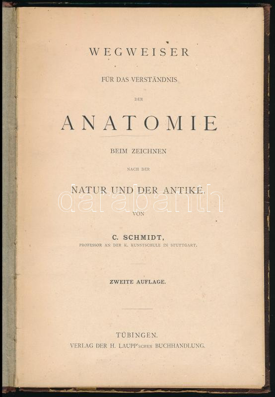 Schmidt, C.: Wegweiser für das Verständnis der Anatomie beim Zeichnen nach der Natur und der Antike. Tübingen, Verlag der H. Laupp'schen Bucchandlung. Félvászon kötés, kopottas állapotban.