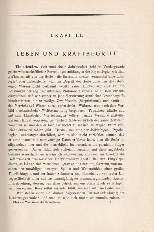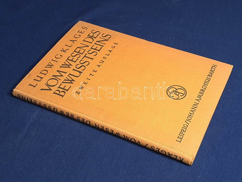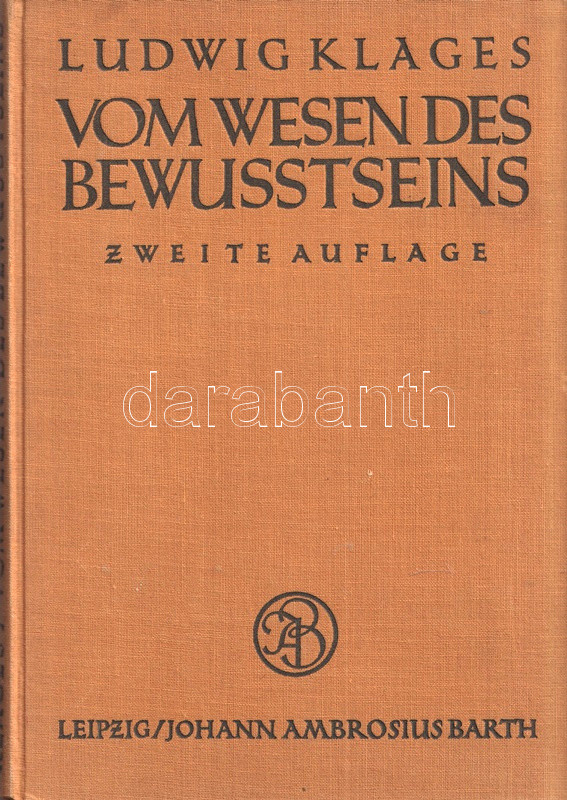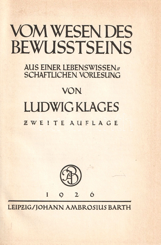 Ludwig Klages (1872-1956) német filozófus, pszichológus és grafológus. Rövid filozófiai dolgozata a tudat természetéről vizsgálódik. A munka első kiadása 1921-ben jelent meg, példányunk a második kiadásból való.
