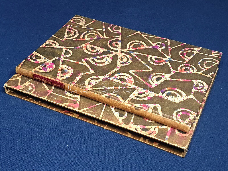 Kézzel merített papírral borított, illusztrált korabeli kartonkötésben és kiadói tokban, az aranyozott címfelirat a gerincen bordó címkén. Dekoratív, szép példány.