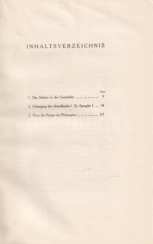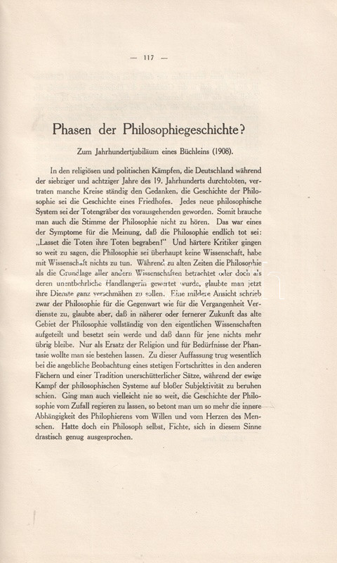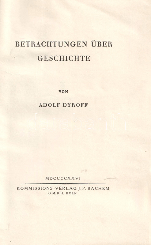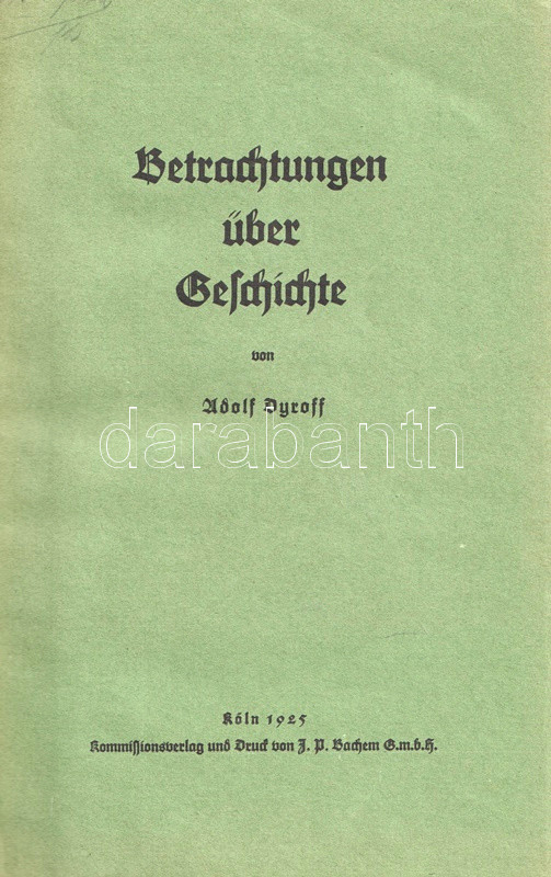 Adolf Dyroff (1866-1943) német filozófus, bonni egyetemi tanár. Katolikus szemléletű történetelméleti esszégyűjteménye kollégája, a szintén katolikus ihletettségű Heinrich Finke középkorász professzor 70. születésnapja alkalmából jelent meg.
