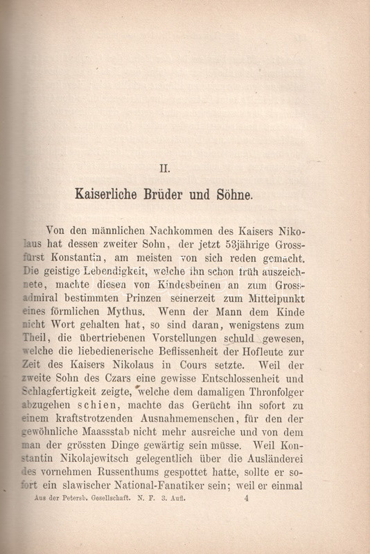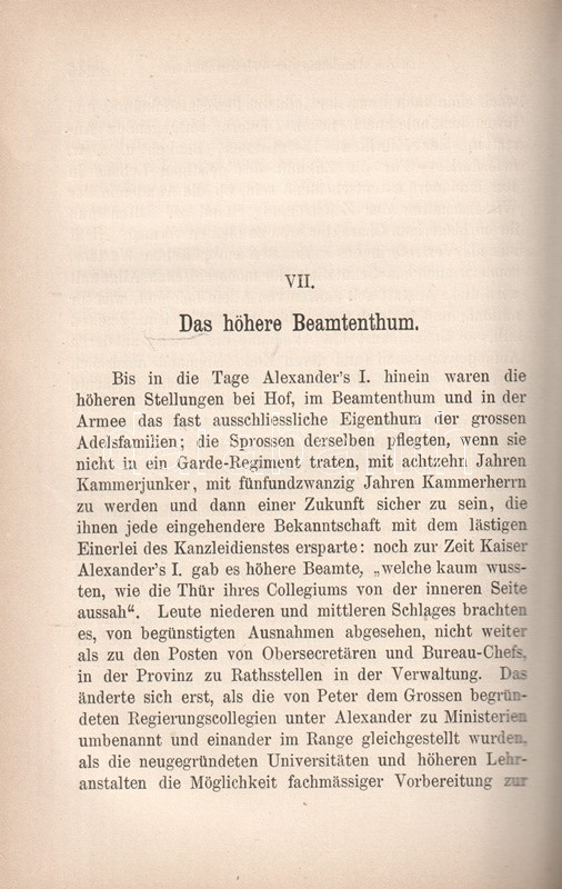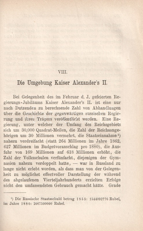 Julius von Eckardt (1836-1908) balti német jogász, író, újságíró, diplomata. A Livóniában felnövő, később Szentpétervárt jogot tanuló von Eckardt 1867-ben hagyta el Oroszországot, onnantól német állami szolgálatban állt. Az orosz közállapotokról, sajtó- és cenzúraviszonyokról, az akadémiai életről, az udvari és köztisztségviselői karrierutak lehetőségeiről írt beszámolója az 1860-as és 1870-es évek cári viszonyait örökíti meg. A név nélkül készült beszámoló első kiadása 1875-ben látott napvilágot, példányunk az átdolgozott, példaanyagában bővített, 1882. évi harmadik kiadásból való.