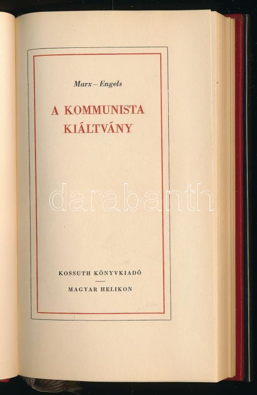 Marx-Engels: A kommunista kiáltvány. Bp., Kossuth-Helikon. 613/3000. számozott példány. Kiadói bőr kötés, műanyag védőborítóval, jó állapotban.
