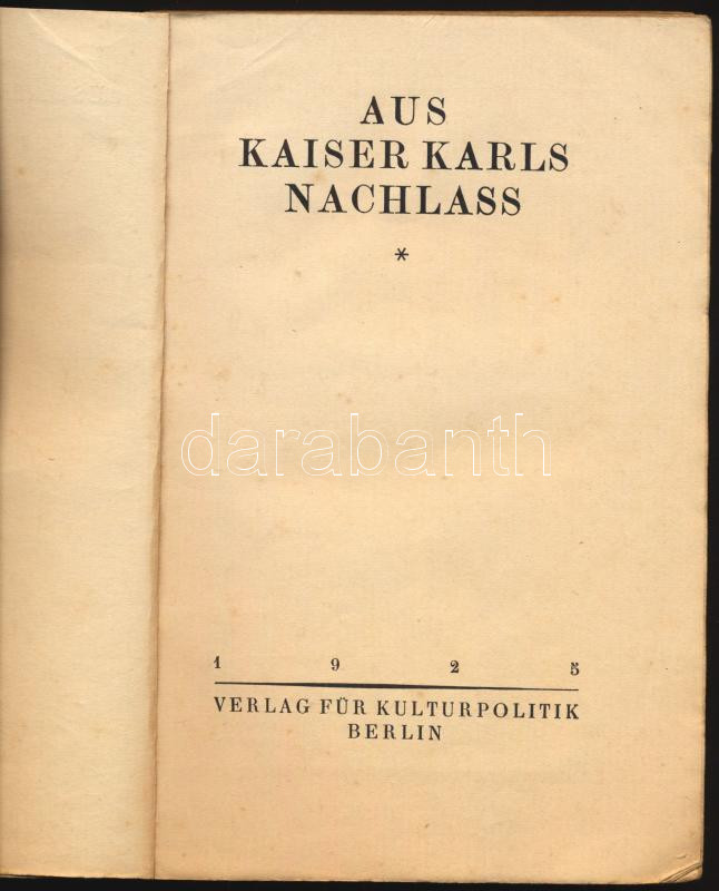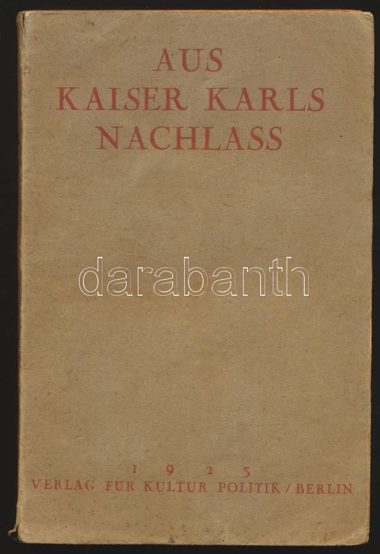 Werkmann, Karl: Aus Kaiser Karls Nachlass. Berlin, 1925, Verlag für Kulturpolitik. 166p. Kiadói papírkötés, gerinc sérült, kopottas állapotban.
