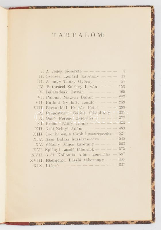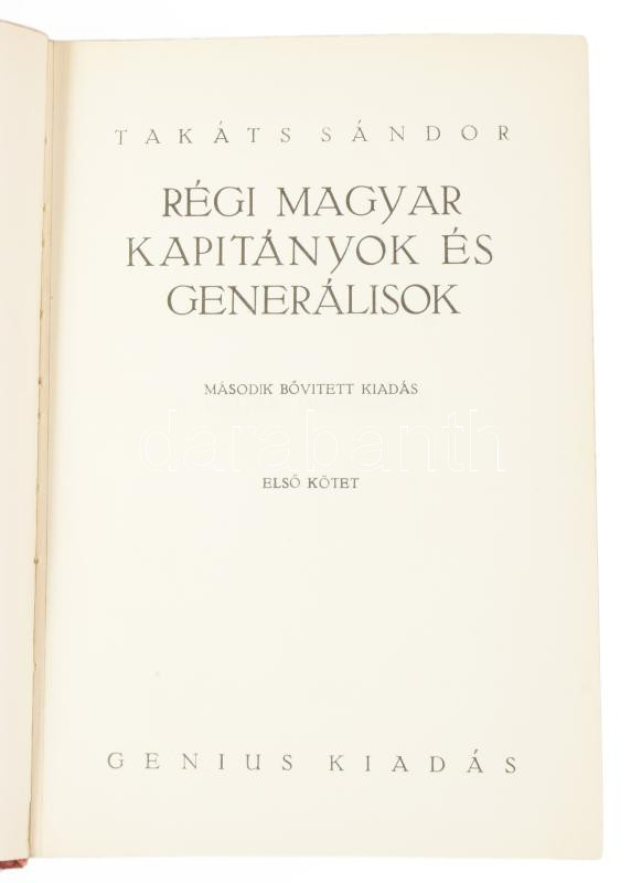 Takáts Sándor: Régi magyar kapitányok és generálisok. I-II. köt. Bp., [1928], Genius (Világosság-ny.), 1-336 p.; 2+337-641+(3) p. Második, bővített kiadás. Kiadói aranyozott gerincű félbőr-kötés, kopott borítókkal, kissé sérült gerincekkel.