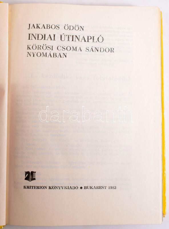 Jakabos Ödön: Indiai útinapló. Kőrösi Csoma Sándor nyomában. Gálfalvi György utószavával. Bukarest, 1983, Kriterion, 446+(2) p.+ 12 (kétoldalas, fekete-fehér fotók) t. Kiadói papírkötés, kissé sérült borítóval.
