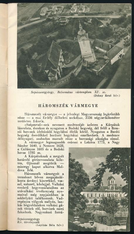 cca 1941 Háromszék vármegye (Erdély) idegenforgalmi prospektus, "a visszatérés emlékére kiadja a Háromszékvármegyei Idegenforgalmi Bizottság, Sepsiszentgyörgy". Bp., Pallas-ny., [36] p. Fekete-fehér képekkel illusztrálva. Kiadói tűzött papírkötés, jó állapotban.