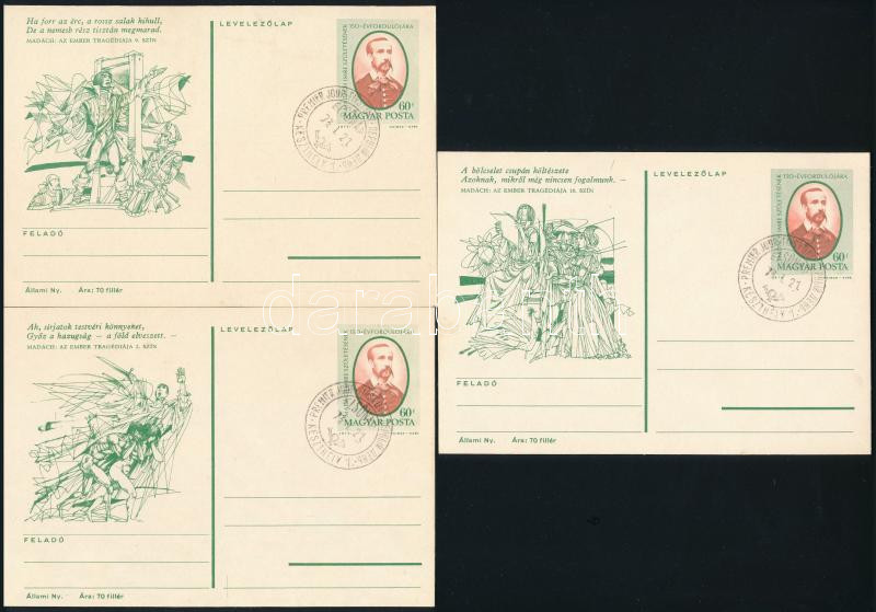 1973 Madách: Az ember tragédiája 15 különféle használatlan díjjegyes keszthelyi elsőnapi bélyegzéssel