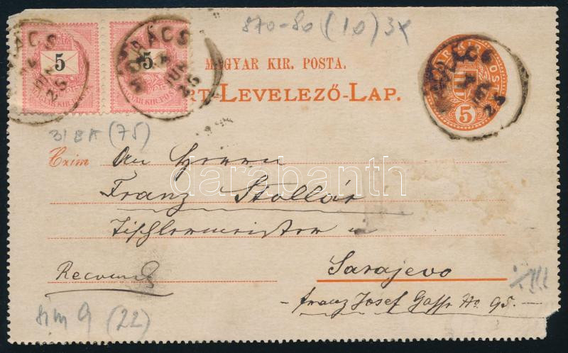 1894 Díjjegyes zárt levelezőlap 2 x 5kr díjkiegészítéssel Szarajevóba