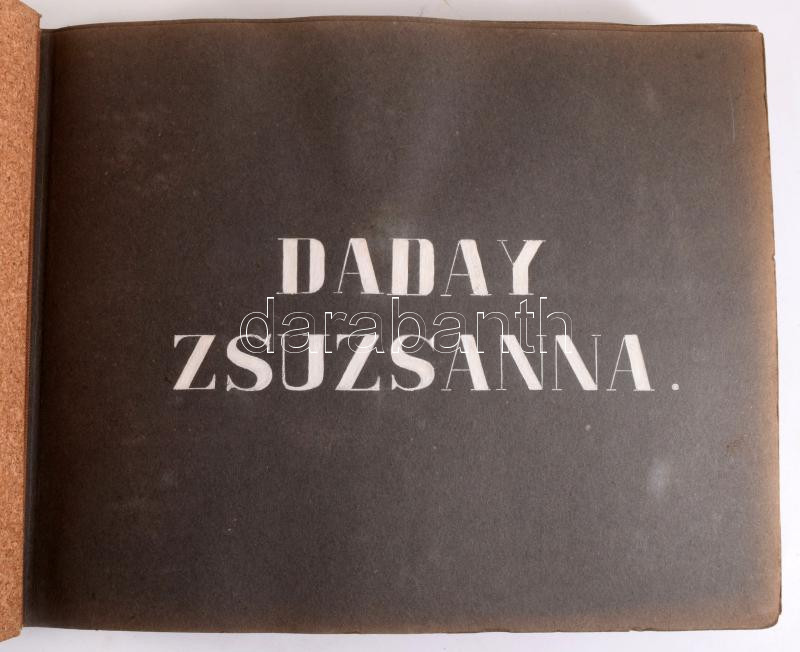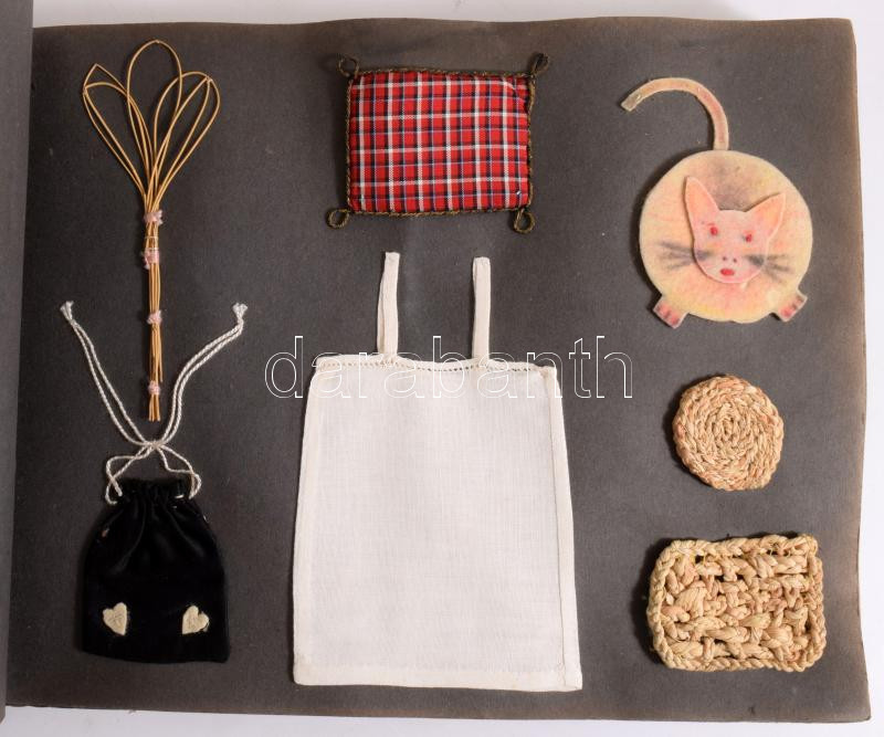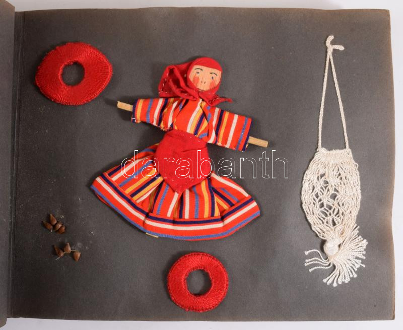 Daday Zsuzsanna kézműves/kézimunka albuma, 22 oldalon különféle hímzett, horgolt, stb. tárgyakkal, valamint kapcsolódó szövegekkel, zsinórfűzéses, parafa borítású albumban, 23,5x30,5x4 cm