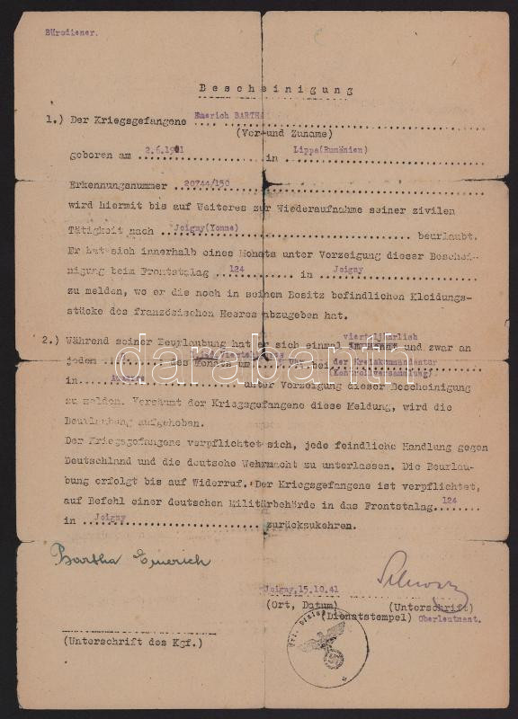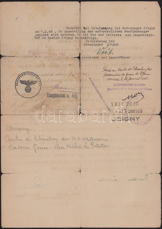 1941 Certificate from the German-controlled Joigny prisoner of war camp for a Hungarian person to leave the camp. Damaged.