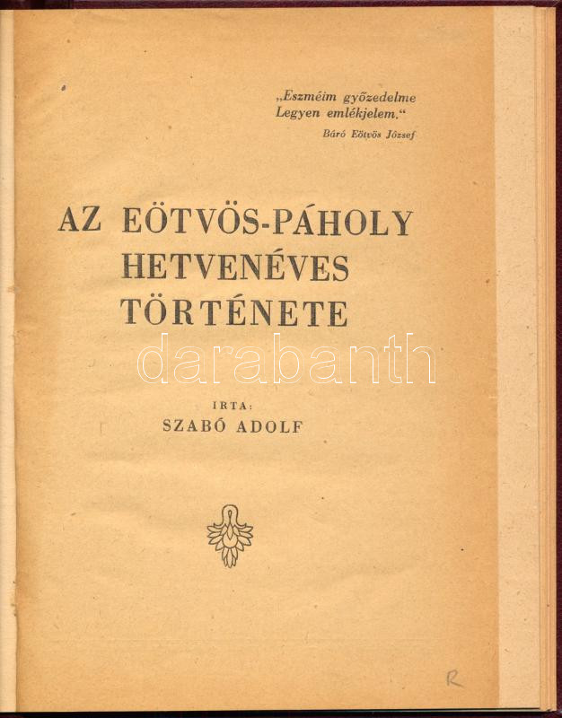 Szabó Adolf: Az Eötvös-páholy hetvenéves története. Bp., 1947, szerző (Márkus-ny.,) 56 p. Egyetlen kiadás. Modern műbőr-kötésben, az eredeti elülső papírborítót bekötötték, nagyrészt jó állapotban. Ritka!
