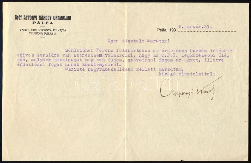 1935 Pálfa, gróf Apponyi Károly (1878-1959) honvéd vezérkari alezredes, nagybirtokos, cs. és kir. kamarás, főrendiházi, majd felsőházi tag autográf aláírásával ellátott, gépelt levele, fejléces levélpapíron