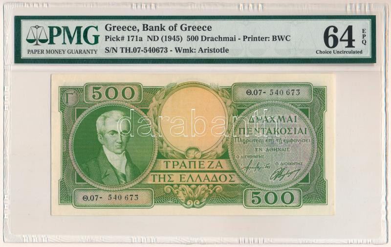 Great Britain / England 1944. 500 Drachmai "540 673" in original PMG case C:UNC (64 Choice Uncirculated)