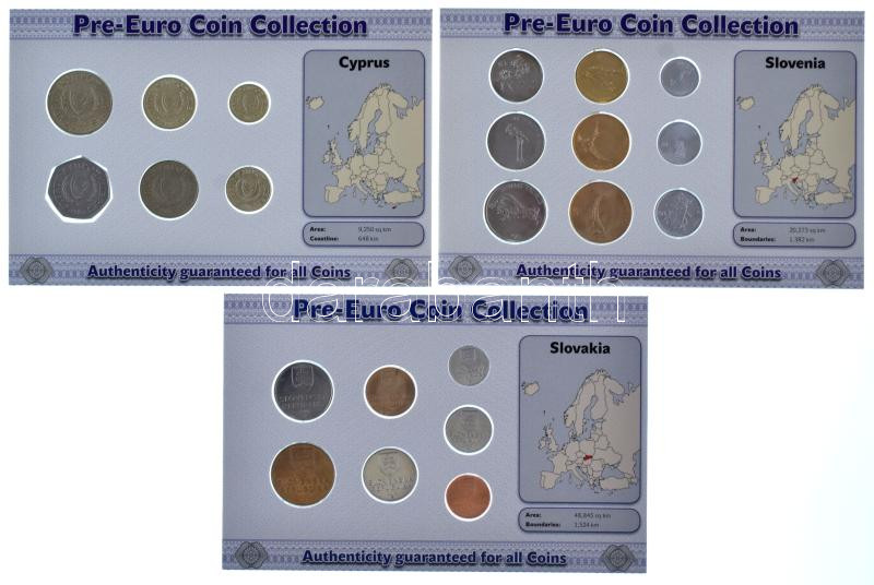 Szlovénia 1992-2005. 10sz-50T (9xklf) forgalmi összeállÃtás "Euró elÅ‘tti érmegyűjtemény" + Ciprus 1993-2004. 1c-50c (6xklf) forgalmi összeállÃtás "Az utolsó nemzeti érmék" + Szlovákia 2002-2007. 10h Al - 10K Cu-Al-Ni (7xklf) forgalmi összeállÃtás, "Szlovákia utolsó nemzeti érméi" mind kartonlapon T:UNC kis patina