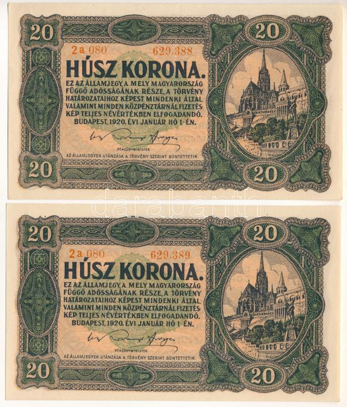 1920. 20K (2x) sorszámkövetők "2a 080 629388 - 2a 080 629389" T:AU