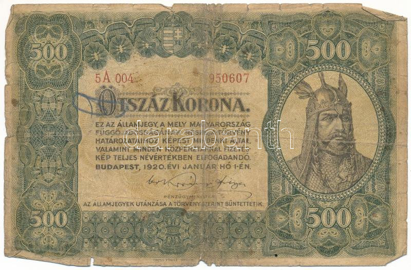 Hungary 1920. 500 Korona "5A 004 950607" "Orell Füssli Zürich" "5A 002 132721" C:VG
