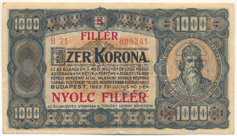 1923. 1000K piros "8 FILLÉR - NYOLC FILLÉR" felülbélyegzéssel, "B 71 8889241" nyomdahely jelölés nélkül T:F pici beszakadások