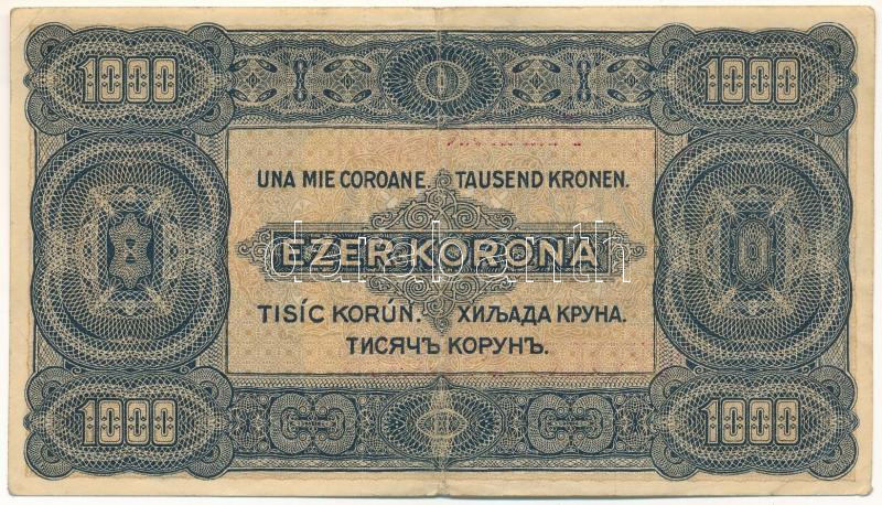 Hungary 1923. 1000 Korona with red "8 FILLÉR - NYOLC FILLÉR" overprint, "B 71 8889241" serial number C:F tiny tears