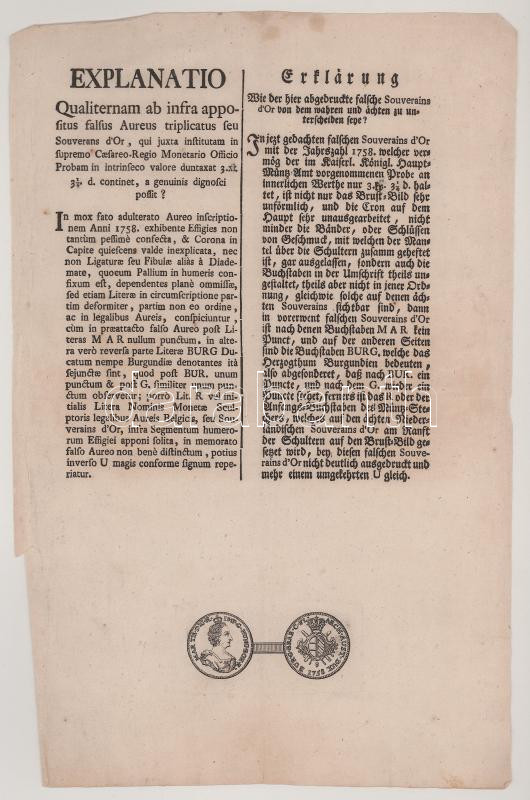 Osztrák Németalföld 1758. Hamis arany sovereign érmére felhívó hirdetmény, a hamis pénz beazonosításához szükséges leírással és az érme rézmetszetű képével 22x34 cm