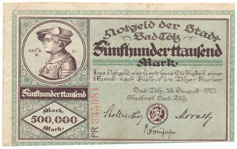 German Empire / Weimar Republic / Bad Tölz 1923. 500.000 Mark necessity note on watermarked paper "335081" C:F (cutting error?)
