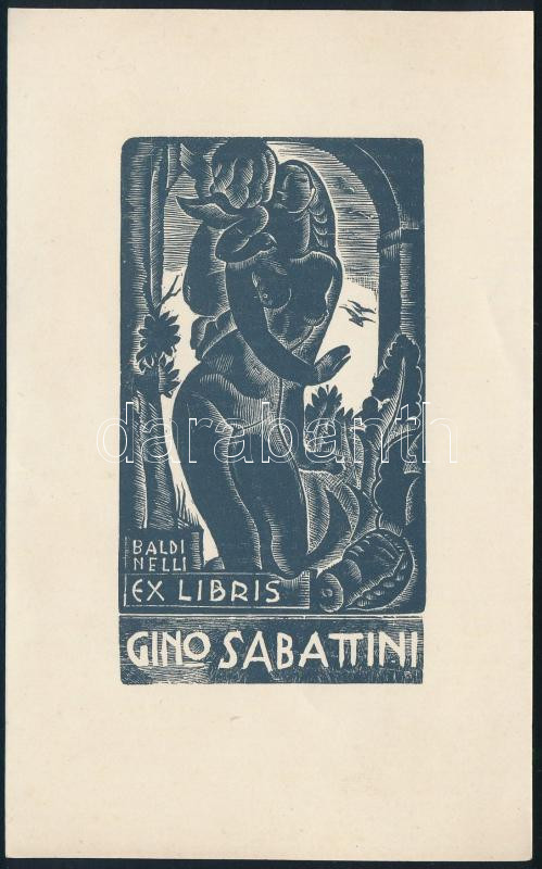 Armando Baldinelli (1908-2002): Ex libris Gino Sabattini, 1936 (erotikus könyvjegy). Fametszet, papír, jelzett a metszeten. 9,5x5,5 cm.