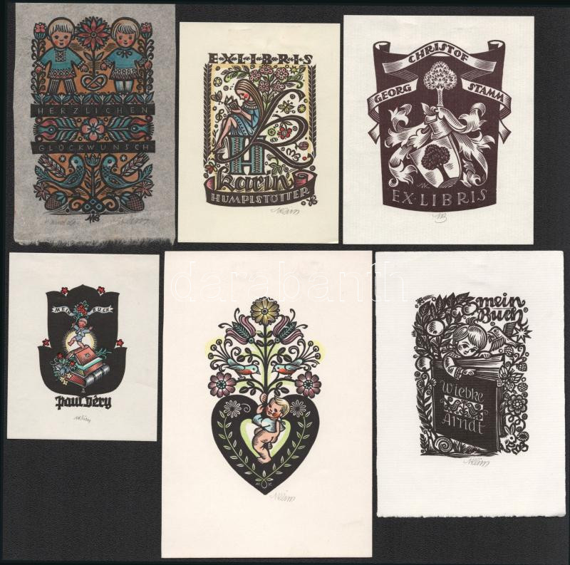 Bauer-Klimbacher, Maria (1911-2000): 6 db ex libris és kisgrafika. Klf. technikák, papír, mindegyik jelzett, klf. méretekben. Hátoldalán paszpartuzás nyomaival.