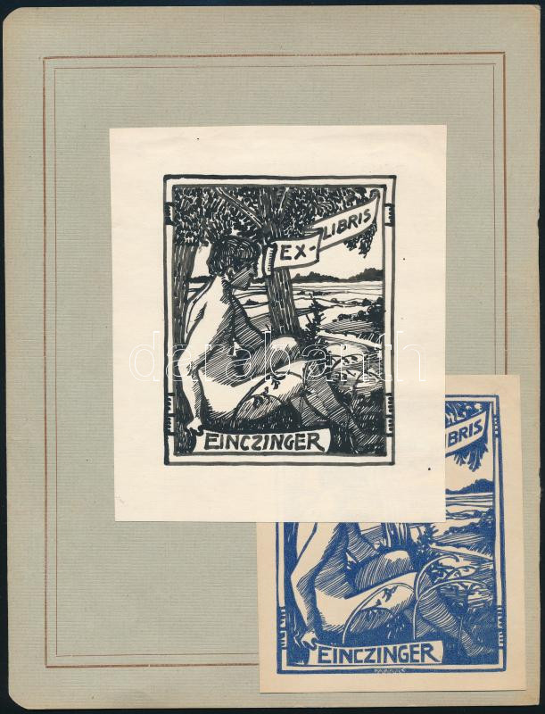Einczinger Ferenc (1879-1950): 2 db ex libris tervek és hozzá tartozó 2 db kész ex libris, egy lap két oldalára ragasztva. Tus, fametszet, papír, tervek jelzés nélkül, kész ex librisek jelzett a metszeten. 8x10 cm körüli méretekben