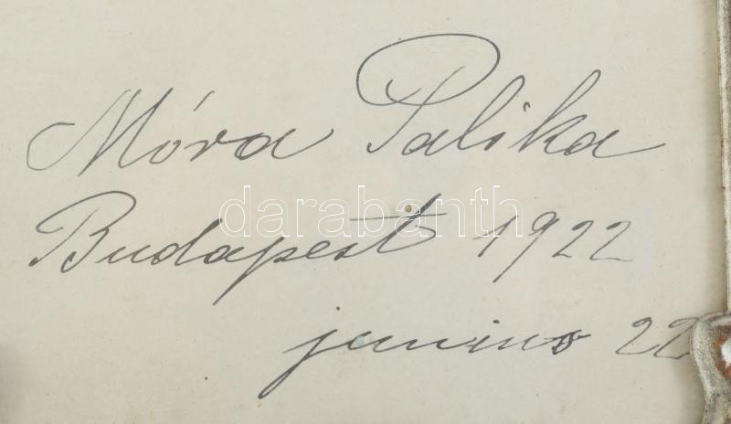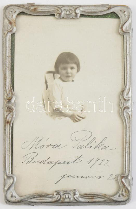 1922 Bp., "Móra Palika" portréja, feliratozott fotólap, szecessziós stílusú, üvegezett fém keretben, külső méret: 14,5x9,5 cm