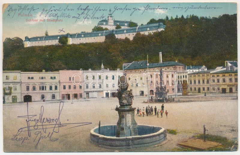 1915 Fulnek, Schloss mit Stadtplatz / castle, square (wet damage)
