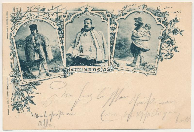 1898 Nagyszeben, Hermannstadt, Sibiu; Rumänischer Bauer, Sächsischer Bauer, Zigeuner. Carl F. Jickeli, Kretzschmar & Schatz / román paraszt, szász paraszt, cigány / Romanian and Saxon peasant, Gypsy folklore. Art Nouveau, floral