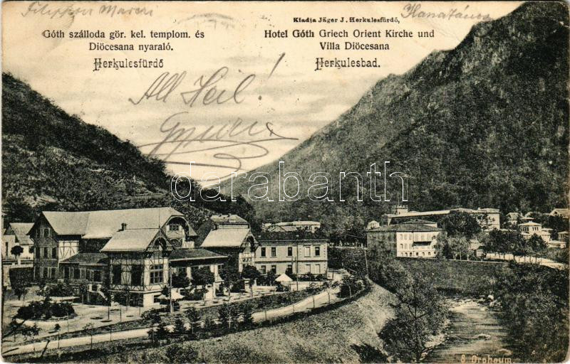 1899 Herkulesfürdő, Baile Herculane; Herkules Platz / tér, Nándor Udvar, Sarolta fürdő. Hirsch József fényképész / square, spa (EB)