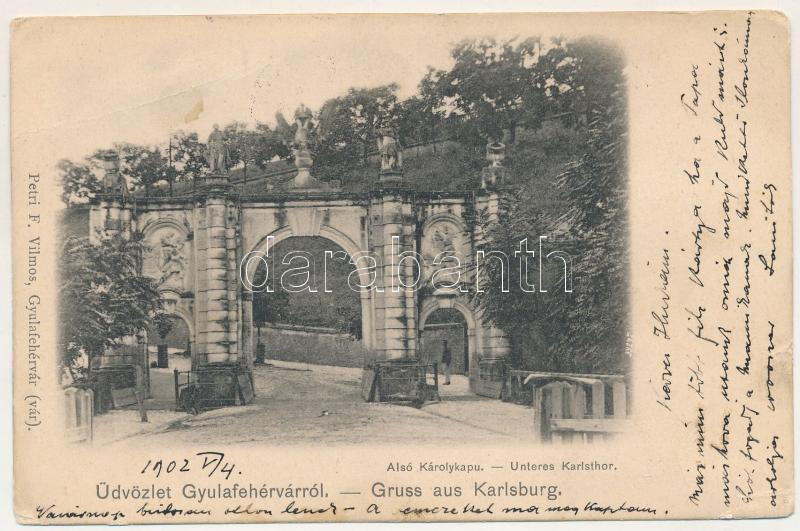 1902 Gyulafehérvár, Karlsburg, Alba Iulia; Alsó Károly kapu. Petri F. Vilmos kiadása / Unteres Karlstor / castle gate (r)