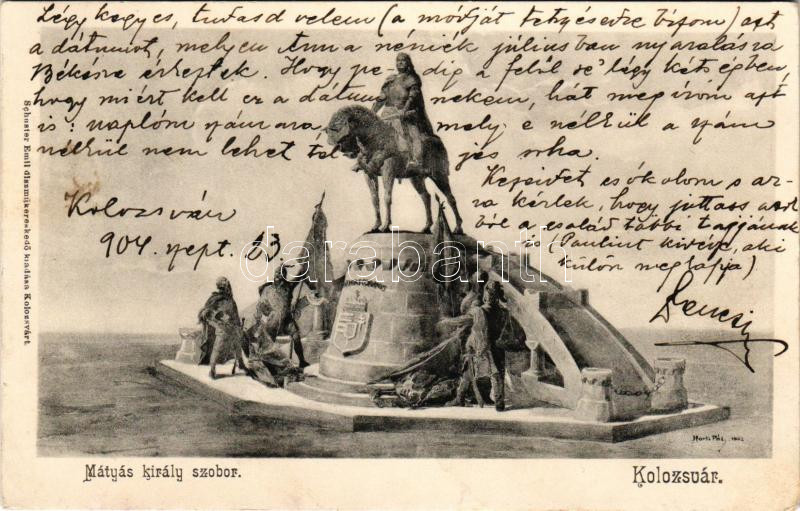 1904 Kolozsvár, Cluj; Mátyás király szobor. Schuster Emil kiadása / monument, statue s: Horti Pál (ázott sarok / wet corner)